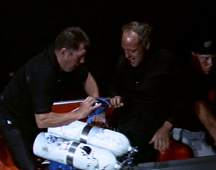 After meeting at the casino, Bond scuba dives to spy on Largo's boat, the Disco Volante. He's caught on the underwater cameras, and Vargas throws hand grenades to try and kill him. He has a good aim, but Bond is too deep for the grenades to catch him, so Vargas decides to chase him in a small speed boat